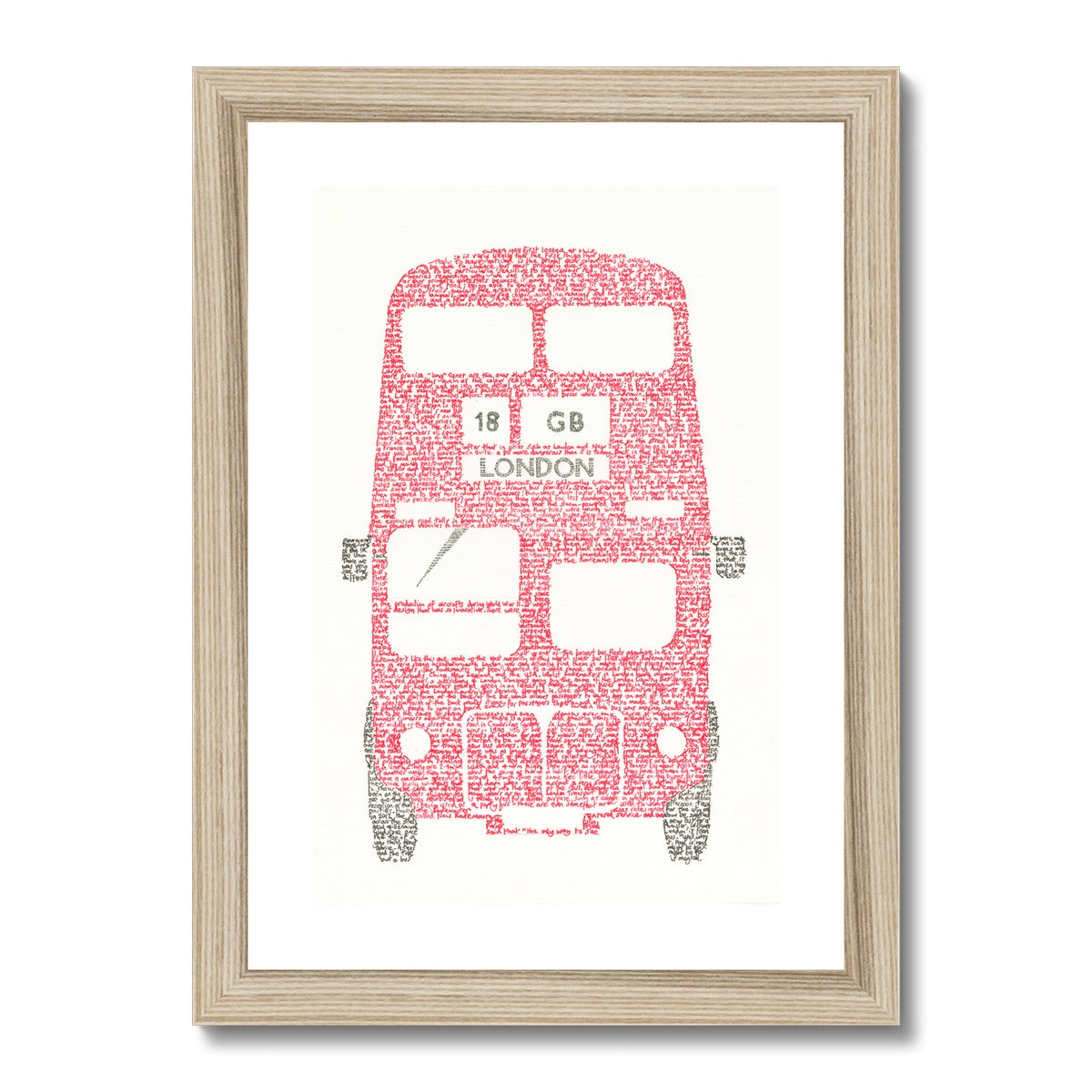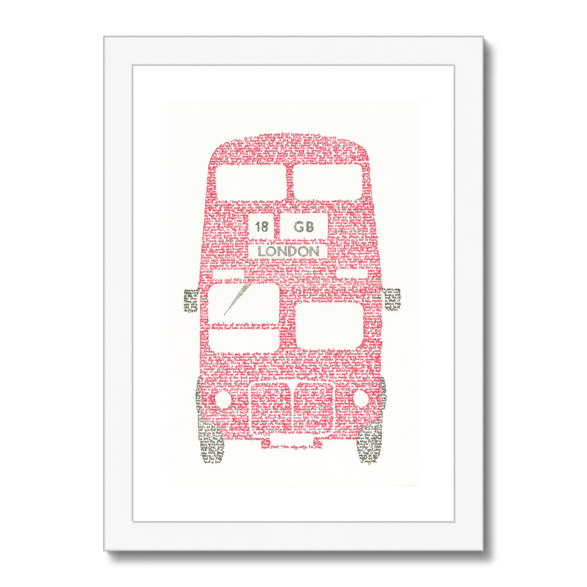 The iconic London Routemaster red bus as you have never seen it before. This A4 framed and mounted print is a stunning picture that is actually made up of tiny handwritten words that go into fascinating detail about everything from the colour red to the history of busses! - Premium, fine art paper with a gently textured surface. - Handmade by specialist picture framers; created from high-quality wood, milled with simple clean lines and presented with a satin finish. and FSC certified. - Includes an off-white mount that will not discolour or fade with age. - Simple, elegant and unique design. - Delivered ready for hanging.